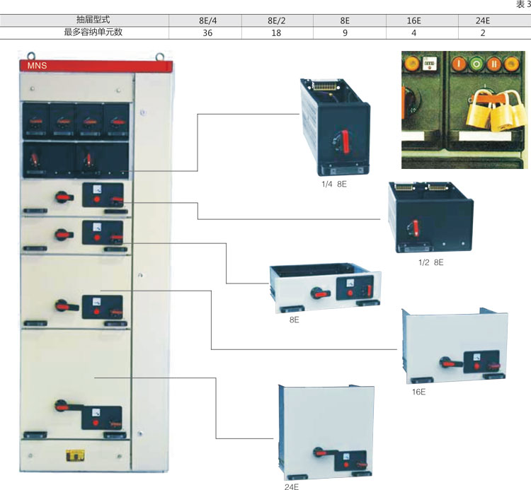 3.柜內(nèi)安裝的框架式斷路器,均能在關門狀態(tài)下實現(xiàn)柜外手動操作,觀察斷路器的分合閘狀態(tài)和根據(jù)操作機構與門的位置關系,判斷出斷路器在試驗位置還是在工作位置。