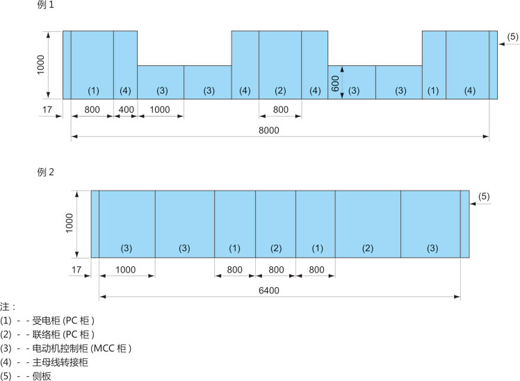 ◎ 當PC與MCC二種裝置相鄰排列時,則:1.當MCC雙面柜(或600深度的MCC單面柜)與PC柜相鄰排列時,在二柜之間必須加轉(zhuǎn)接柜(其寬度為400mm)如圖6例1所示。2.將單面操作的MCC加深到1000mm時,則可以不加轉(zhuǎn)接柜,如圖6例2所示。